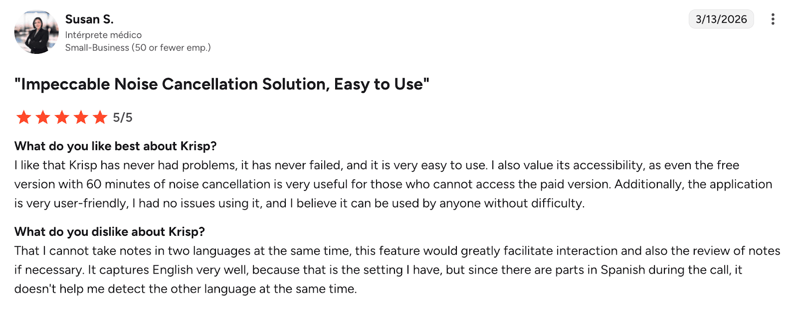 Users consistently value Krisp for its ability to clean up meeting audio in real time, which directly improves transcription accuracy and overall meeting clarity. They also highlight its ease of use, seamless integration across platforms, and reliable performance, making it a low-friction tool in daily workflows. Beyond transcription, features like AI-generated summaries, recordings, and interactive transcripts contribute to a more structured and productive meeting experience.