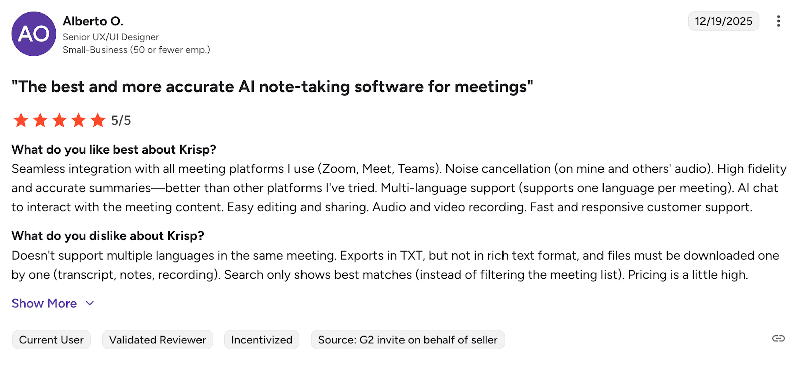 If your priority is live meeting quality and accurate documentation, Krisp stands out as the most complete solution. If you’re optimizing for team workflows, task management, or post-meeting insights, other tools may align better with your stack.