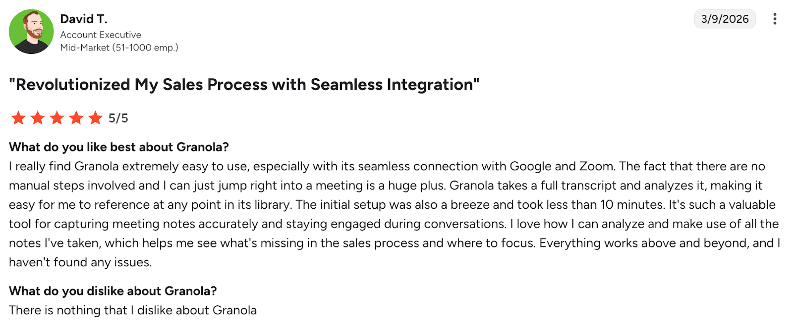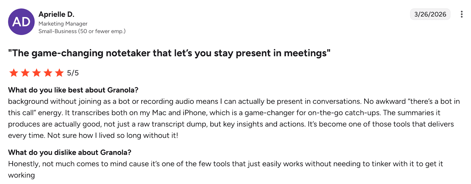Users consistently highlight Granola’s ability to run unobtrusively in the background, allowing them to stay fully engaged in meetings without the friction of bots or manual note-taking. Its clean, insight-driven summaries, combined with fast setup, seamless integrations, and cross-device usability, make it a highly accessible tool that “just works.” Many also value its reliable performance and searchable meeting library, which turns conversations into reusable insights over time.