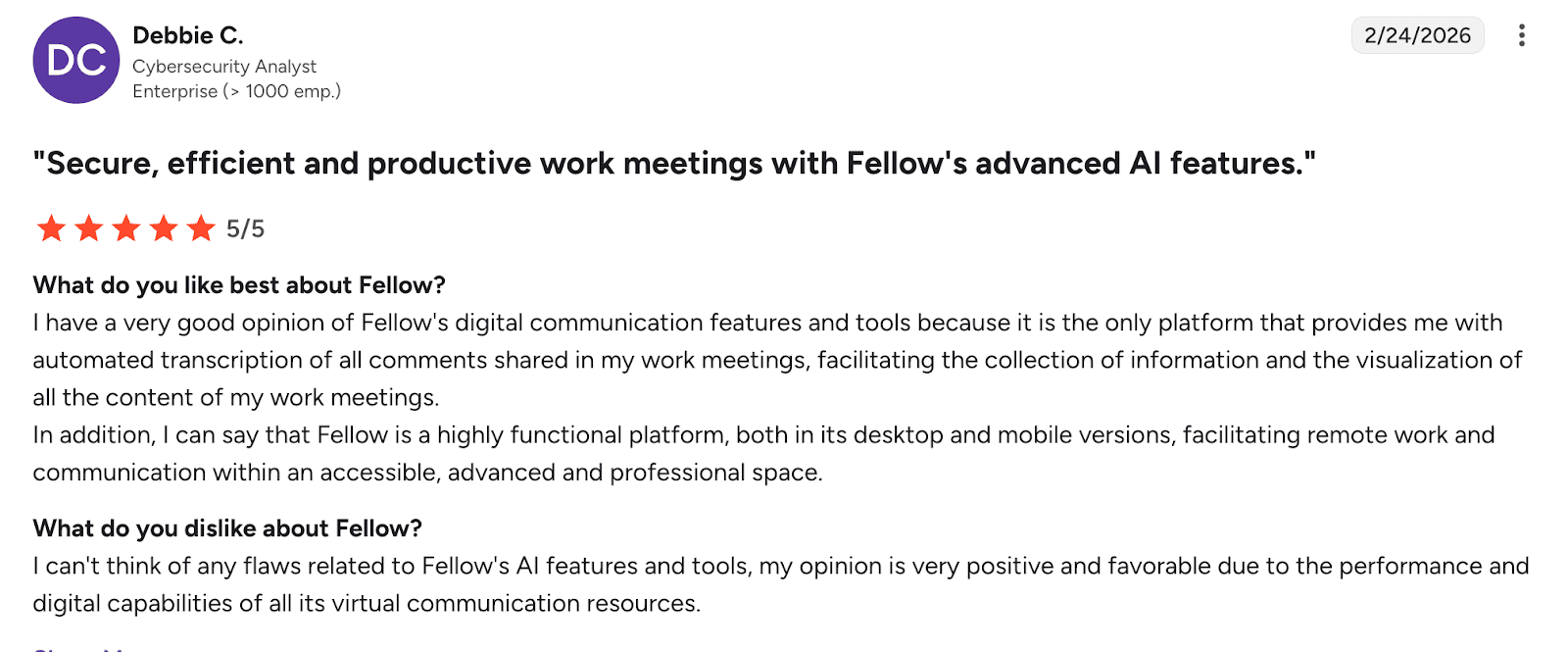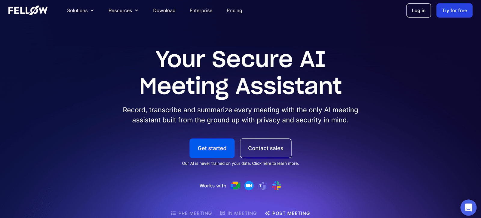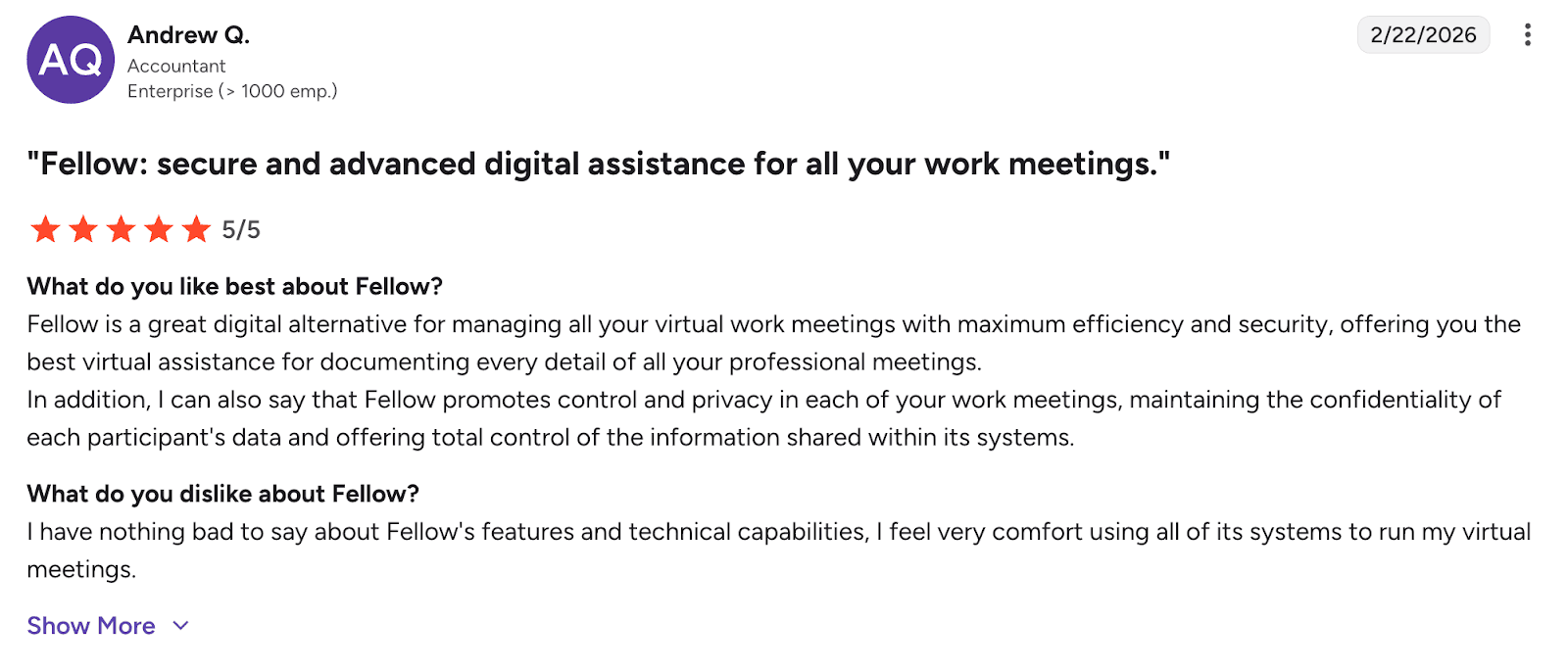 A key differentiator is its strong integration layer and workflow orientation. Fellow connects directly with tools like Slack, Notion, HubSpot, and project management systems, ensuring that meeting outputs don’t stay isolated but instead flow into execution.