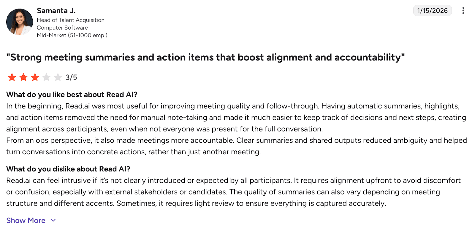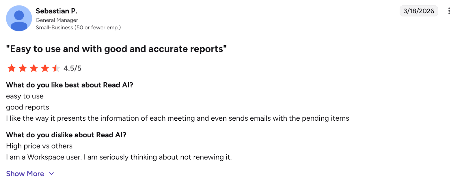 Users consistently highlight Read.ai’s clear summaries, automatic transcription, and structured meeting insights, which help reduce note-taking effort and improve accountability after meetings. Many also appreciate its ease of use and ability to capture action items and key moments, allowing them to stay focused during conversations. However, users report that summaries can sometimes be too general and miss nuanced details, especially in fast-paced discussions. A more significant concern is the tool’s intrusive meeting presence (bot joining calls) and integration issues, which can negatively affect user trust and workflow. Overall, Read.ai is seen as a feature-rich and productivity-enhancing assistant, but one that can feel intrusive and less reliable in execution.