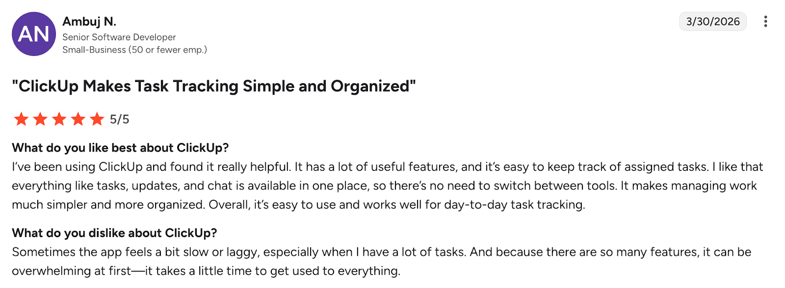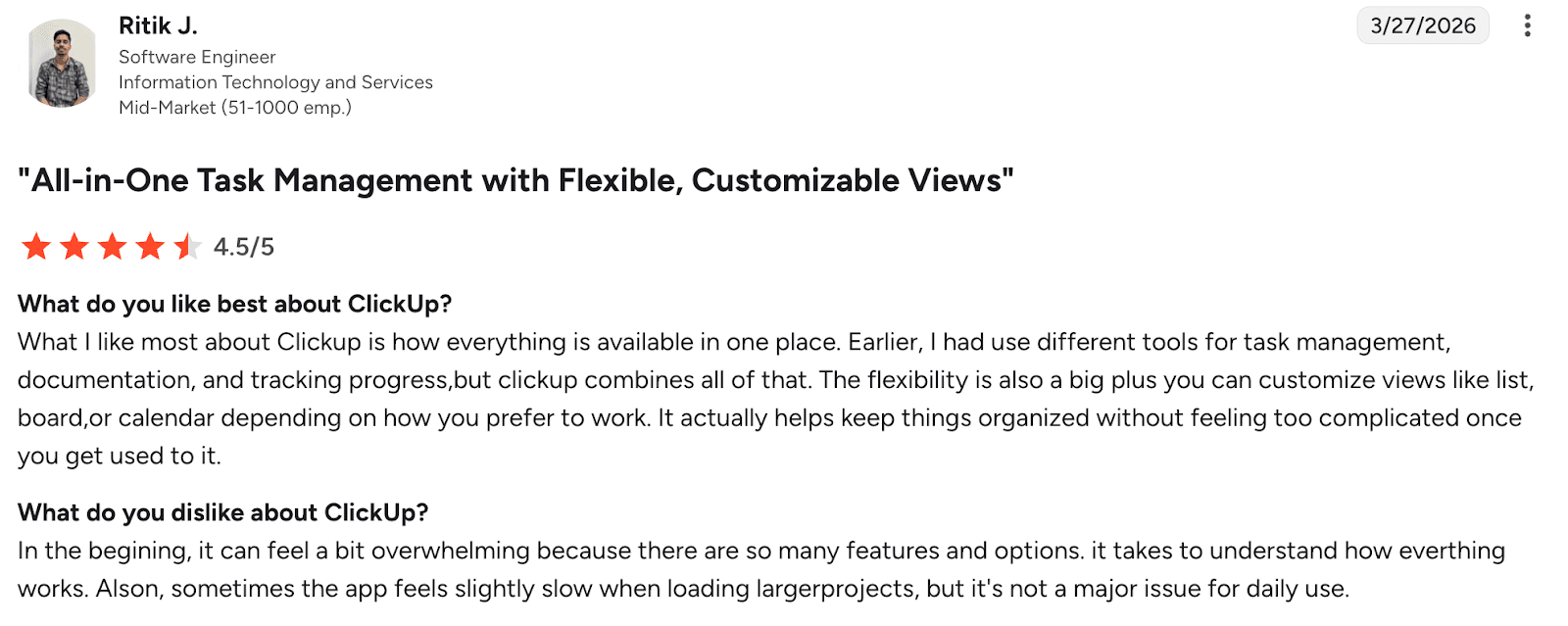 | ClickUp | Good | Excellent | Excellent | Medium | Excellent | Low–Medium (learning curve) | All-in-one workspace (notes + execution) |