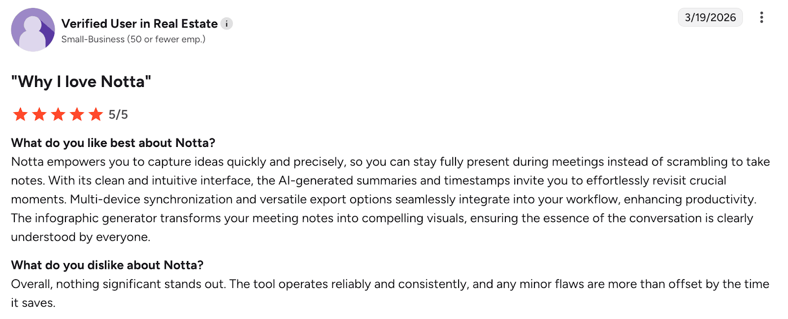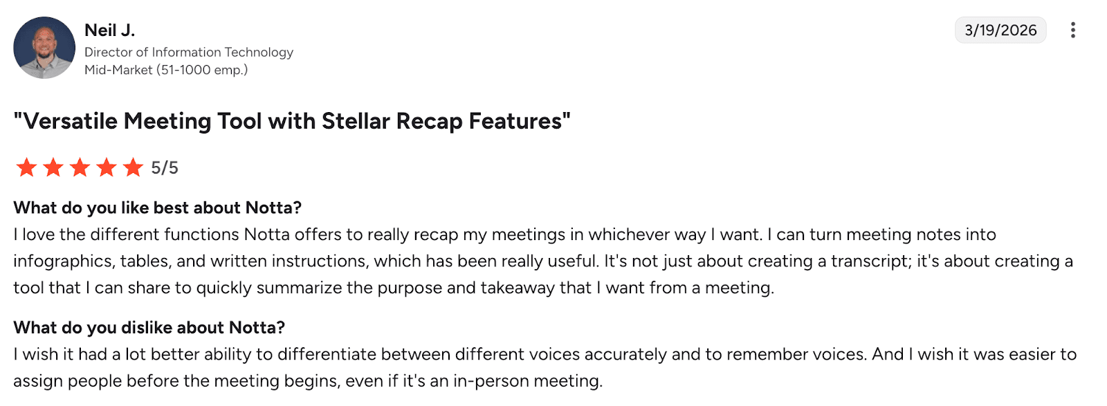 Users consistently highlight Notta’s high transcription accuracy and speed, especially appreciating its ability to handle multiple languages and generate real-time text with minimal effort. Many also value its clean interface and ease of use, along with features like timestamps, searchable transcripts, and cross-device syncing that improve workflow efficiency. However, users report that accuracy can drop in noisy environments or with overlapping speech, requiring manual corrections in some cases. Another common concern is the limited free plan and relatively high pricing, which restrict access to key features. Overall, Notta is seen as a reliable and efficient transcription tool, but with limitations in consistency and pricing for broader use.