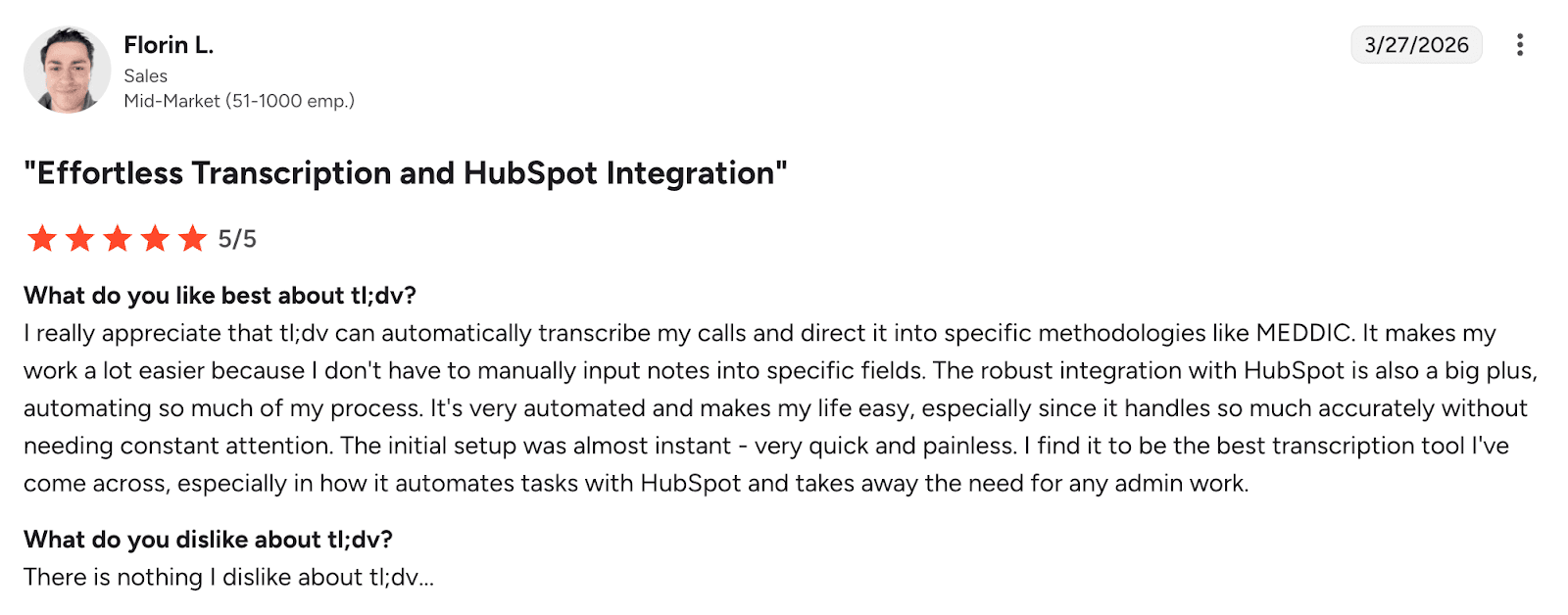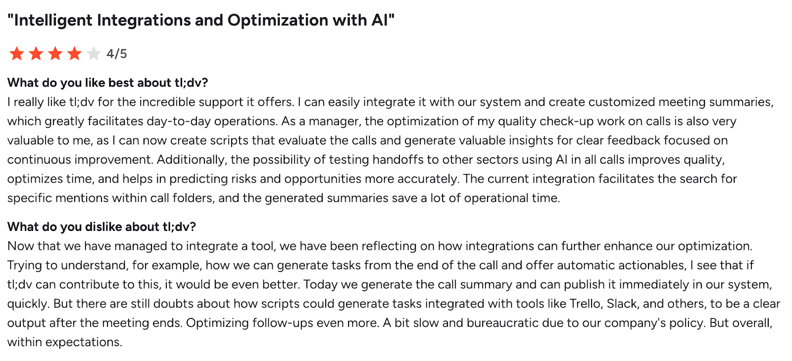 Users consistently highlight tl;dv’s ease of use and seamless onboarding, noting that it integrates smoothly into meetings and allows them to stay focused without manual note-taking. Many appreciate its automatic recordings, searchable transcripts, and AI-generated summaries, which significantly improve productivity and collaboration. However, users report that transcription accuracy can be inconsistent, especially in multilingual conversations, with some transcripts failing to generate altogether. Others mention limitations such as missing features, recording constraints, and occasional integration issues, which can disrupt workflows. Overall, tl;dv is seen as a highly efficient, user-friendly meeting assistant, but one that still requires improvement in reliability and advanced functionality.
