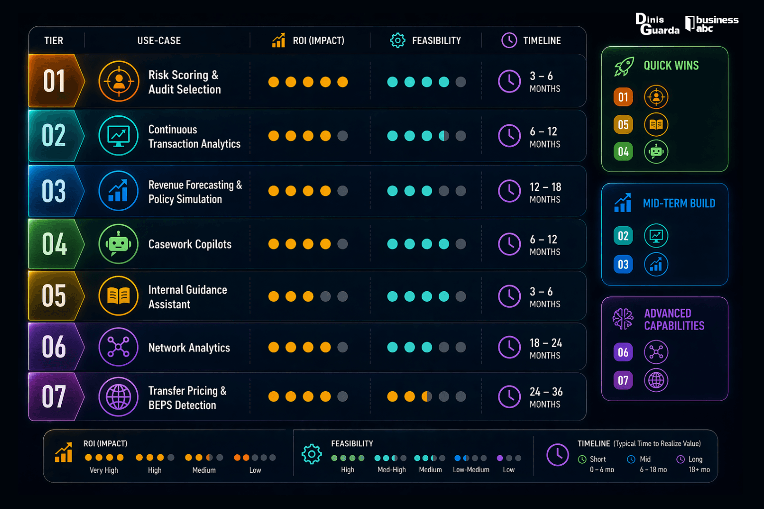This tiered approach ensures that each implementation phase builds institutional capability whilst delivering measurable value. Early successes in risk scoring and transaction analytics lay the foundation for capabilities and stakeholder confidence, paving the way for more ambitious applications in network analysis and international tax compliance.