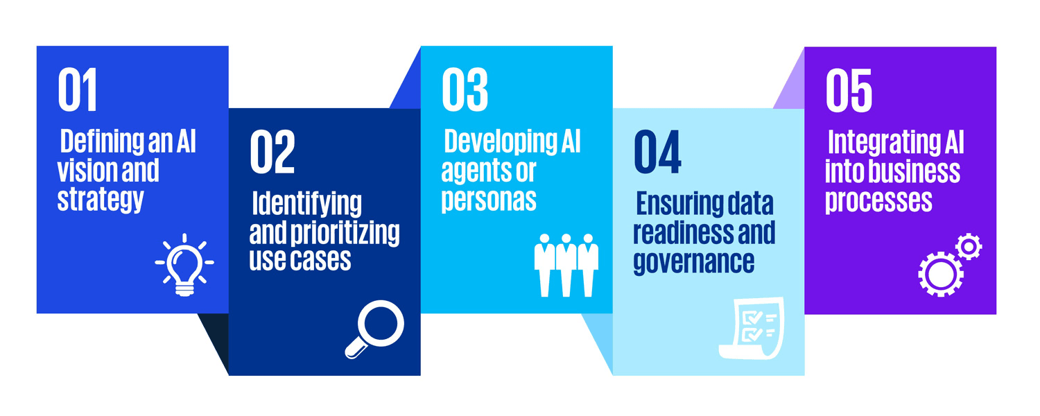 - How: A five-step maturity model strategy, use-case prioritisation, AI agents, governance, and process integration.