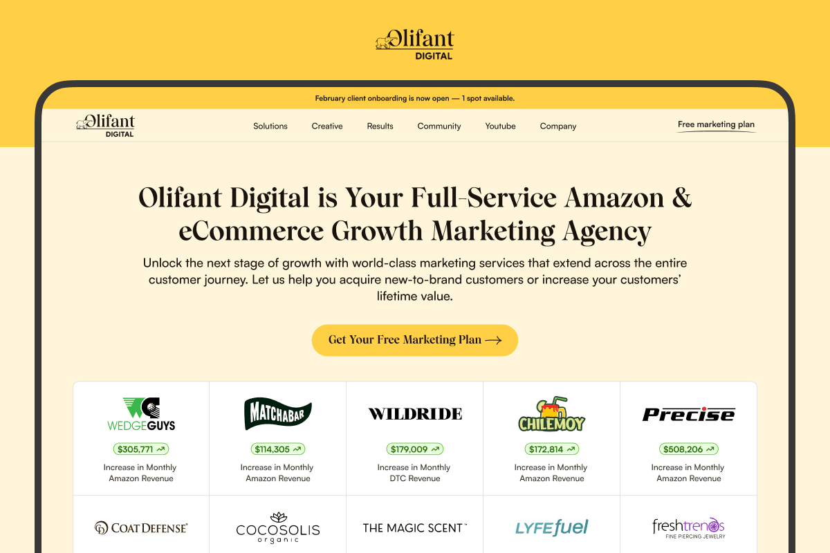 Olifant Digital is an Amazon marketing agency that fixes the broken agency–client model with aligned incentives and guaranteed outcomes. Operating as a highly selective boutique (maximum 2-4 new clients monthly), they stake their compensation on hitting agreed performance metrics, offering full refunds when targets aren't achieved.