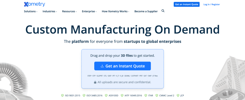 Xometry built its reputation on instant quoting and rapid turnaround. The platform uses an AI-powered engine that analyzes uploaded CAD files and returns pricing immediately, which makes it popular with engineering teams that need fast iteration during product development.