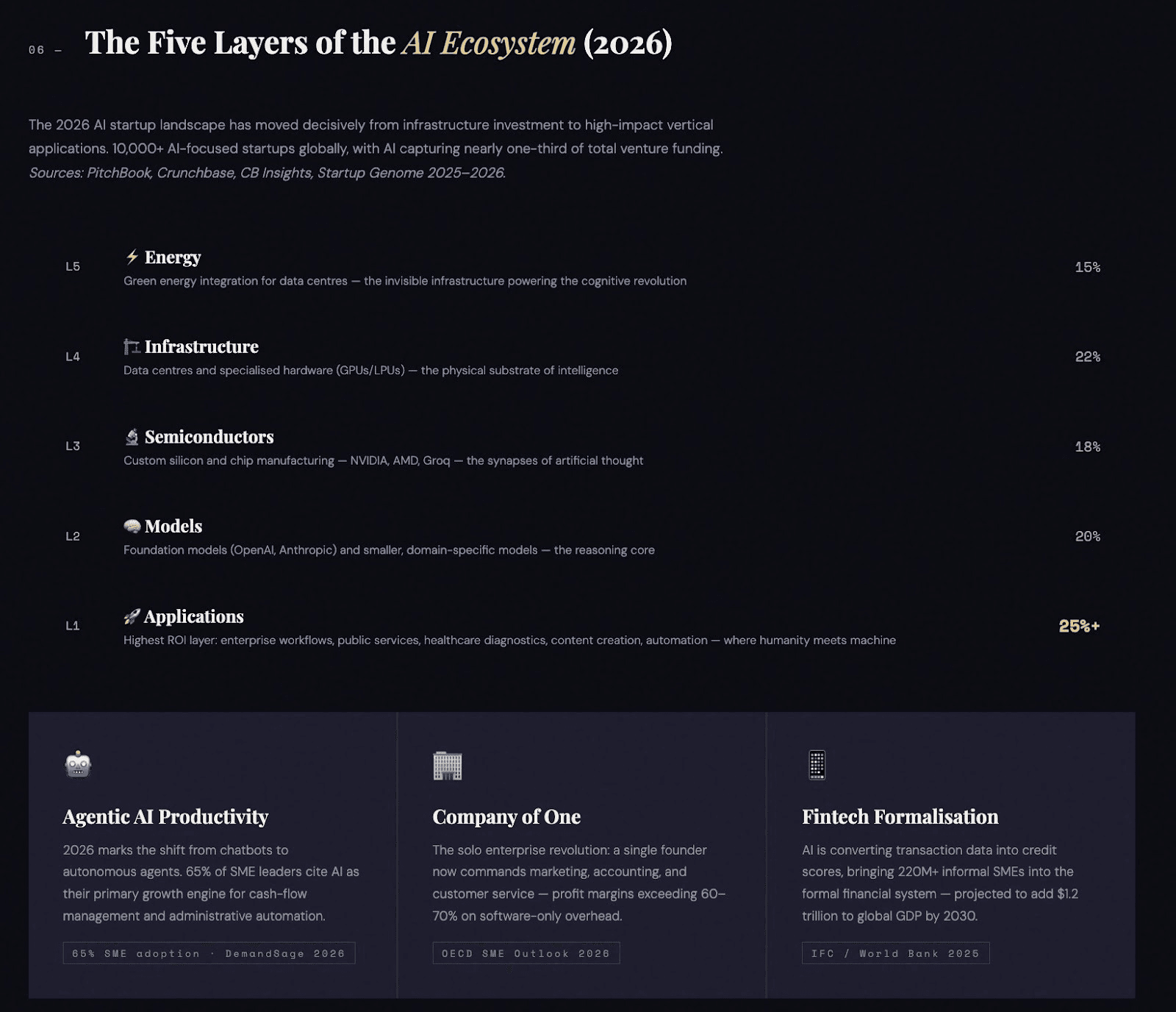 - Applications: The layer with the highest ROI, focusing on enterprise workflows and public services.