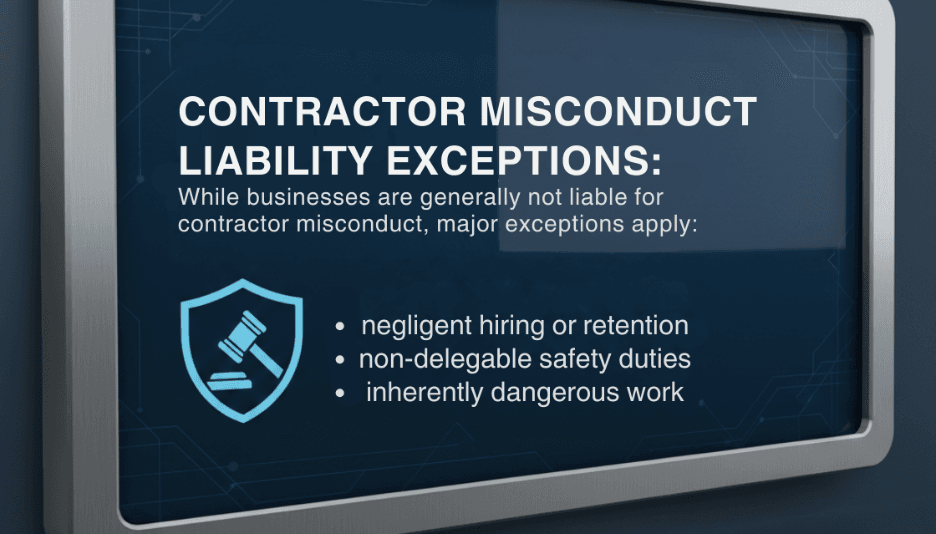 Another trap is misclassification. If you control how work is performed, not just the outcome, courts may reclassify contractors as employees. That instantly triggers vicarious liability.