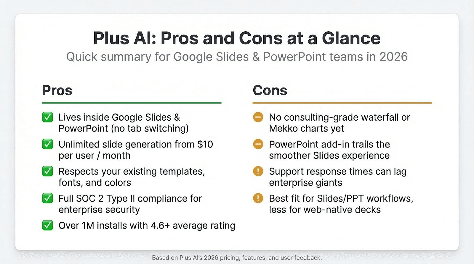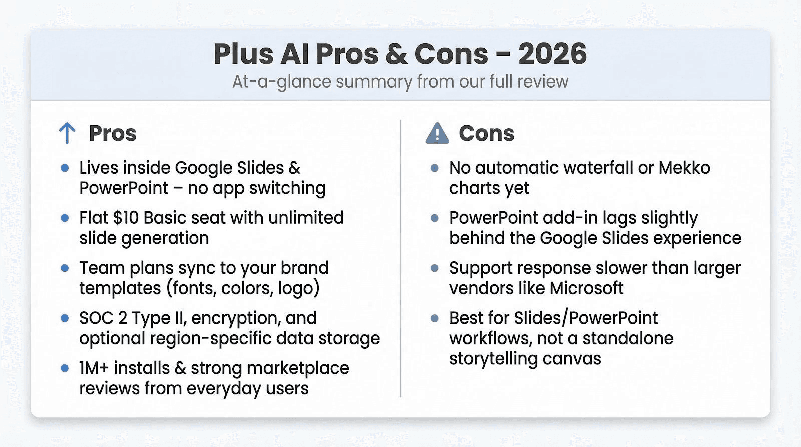 Choosing the right AI presentation tool in 2026 comes down to workflow fit, price tolerance, and compliance needs. For teams anchored in Google Slides or PowerPoint, Plus AI offers the smoothest blend of in-app convenience, predictable pricing, and enterprise-grade security. Stand-alone builders like Gamma or Tome dazzle with narrative flair, while heavyweights such as Microsoft 365 Copilot and Canva Magic Design flex ecosystem muscle. Niche upstarts push boundaries but still lack export polish. Map your priorities against these strengths and gaps, and the best choice will surface quickly—often with Plus AI at the top of the shortlist.