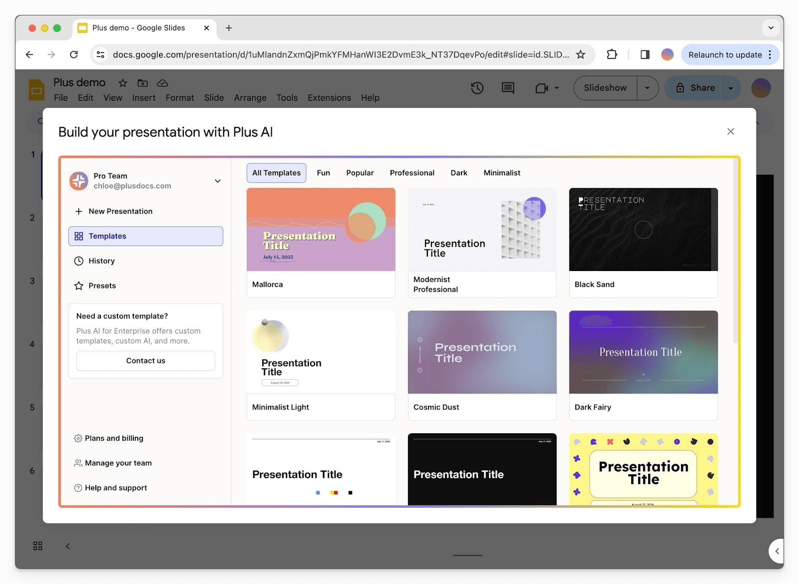 Cost sits above the add-in tier: the Team plan runs $40 per user each month. You get slick design automation and a large template library, but no SOC-grade compliance badge and no way to force every slide to follow your official master. For companies with strict brand rules, that gap often sends them back to a tool that respects native templates, such as Plus AI inside Slides or PowerPoint.