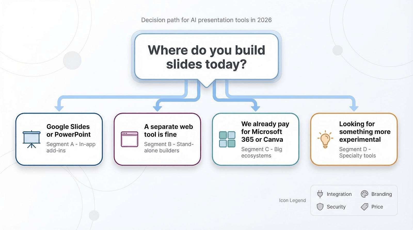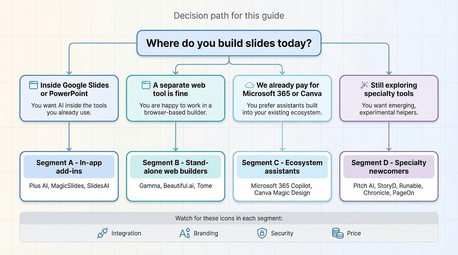 Picture a slim flowchart. At the top, a single question waits: “Where do you build slides today?”
