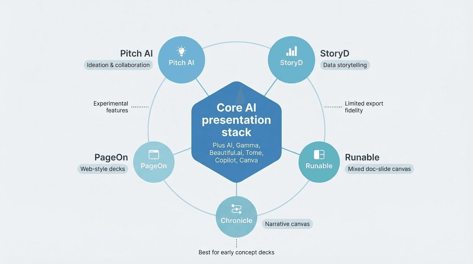 A handful of newcomers such as Runable, Chronicle, and PageOn push the idea further by merging docs, websites, and slides into one continuous canvas. They hint at a future where “presentation” is just another content view. Right now they serve startups looking for visual flair, but they lack the security, template discipline, and export fidelity most established teams need.