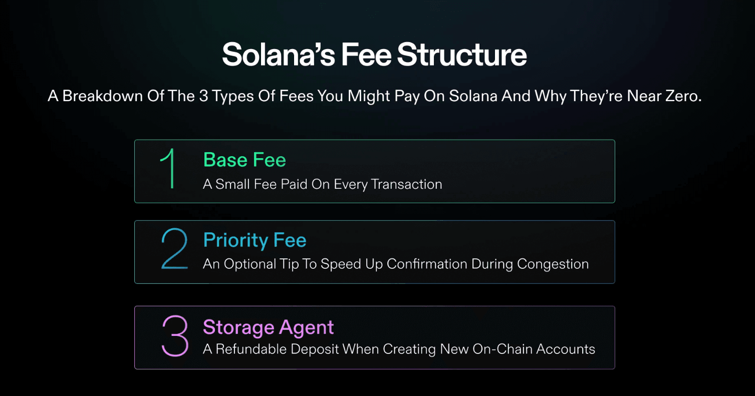 - Storage Rent: For creating new accounts, such as token accounts, Solana requires a small deposit (~0.002 SOL). This rent is refundable when the account is closed, preventing network spam and helping with efficient storage management.
