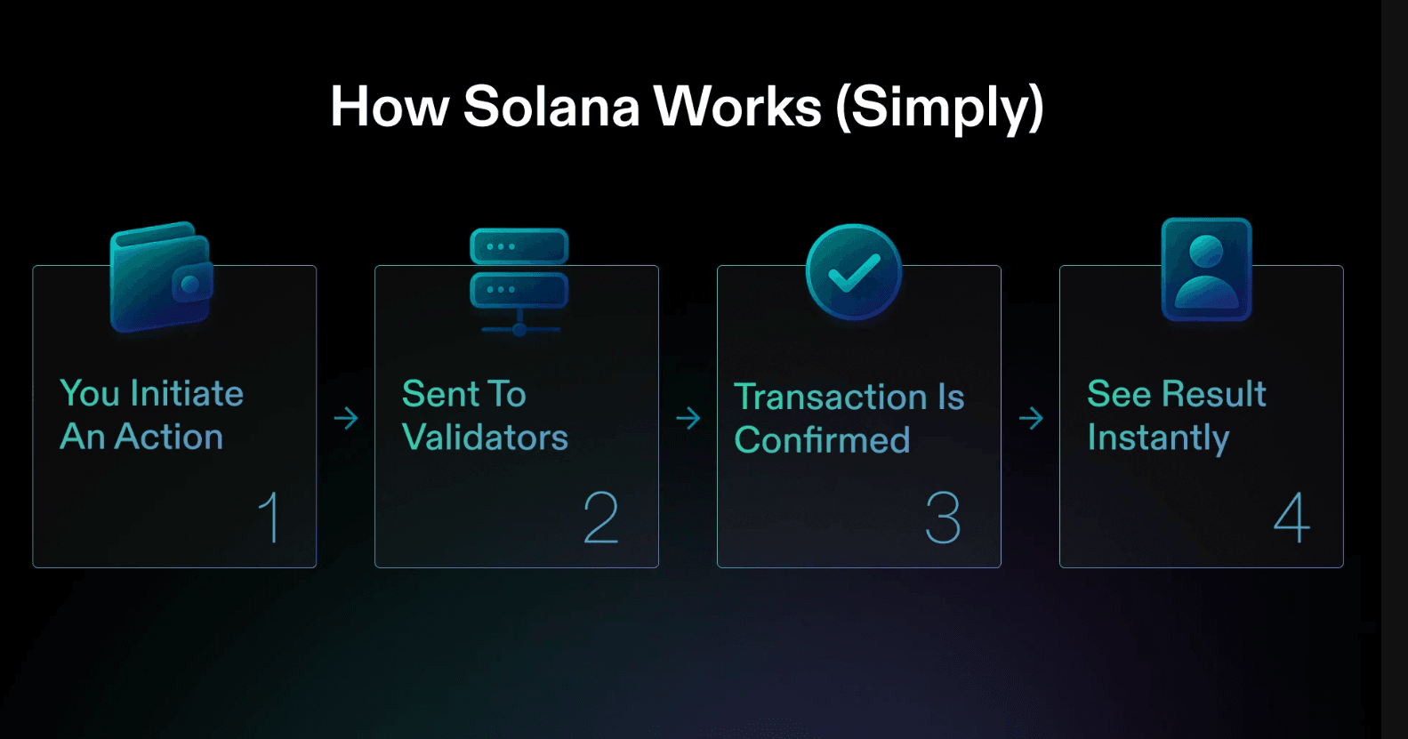 Step 2: Validation by Validators- Your transaction is sent to Solana’s validators, which are independent computers that verify and confirm that the transaction is legitimate.