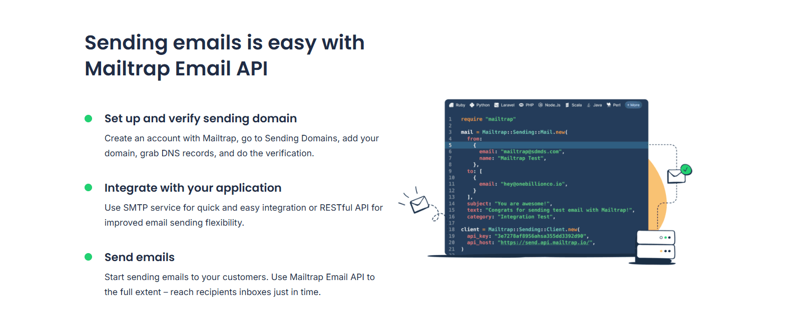 - Developer-friendly Integration. RESTful API with SDKs for major languages, SMTP service with code snippets for 20+ frameworks, comprehensive documentation.