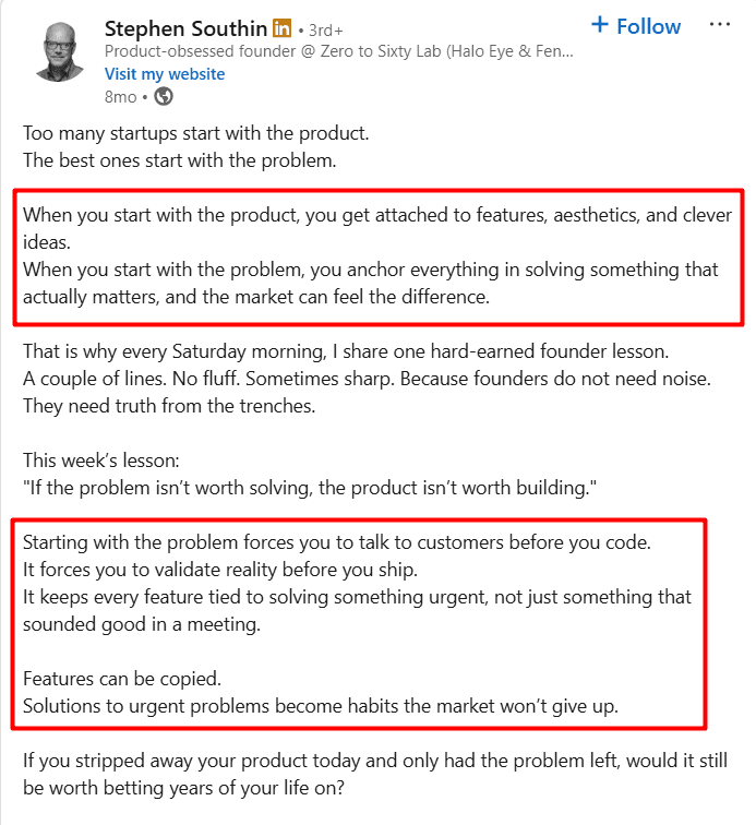 It’s the classic “features vs benefits” concept. Here’s how one founder describes this concept on LinkedIn: